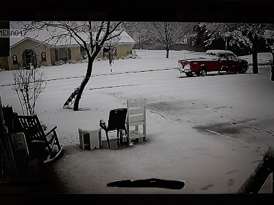 The driveway is getting covered with snow and the street has a considerable amount too. I have a photo taken from a security camera, so I did not need to get cold taking the photo.